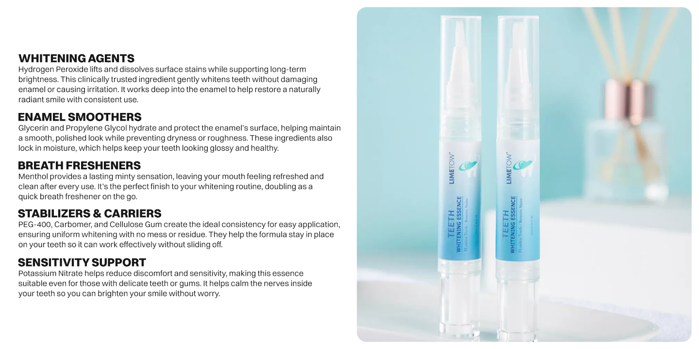 The LIMETOW® Teeth Whitening Essence is designed to brighten, refresh, and protect your teeth with every use. Its advanced blend of whitening agents and soothing elements supports enamel strength, breath freshness, and long-term oral confidence.