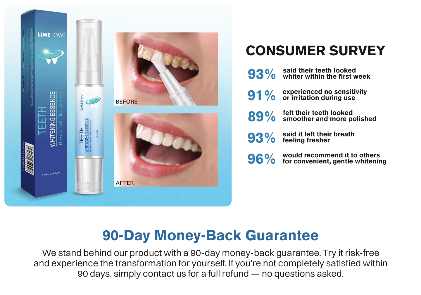 With consistent application, the LIMETOW® Teeth Whitening Essence helps reveal a naturally white, radiant smile. Whether you’re getting ready for a night out or just want to feel more confident day-to-day, this essence delivers lasting freshness and visible results.